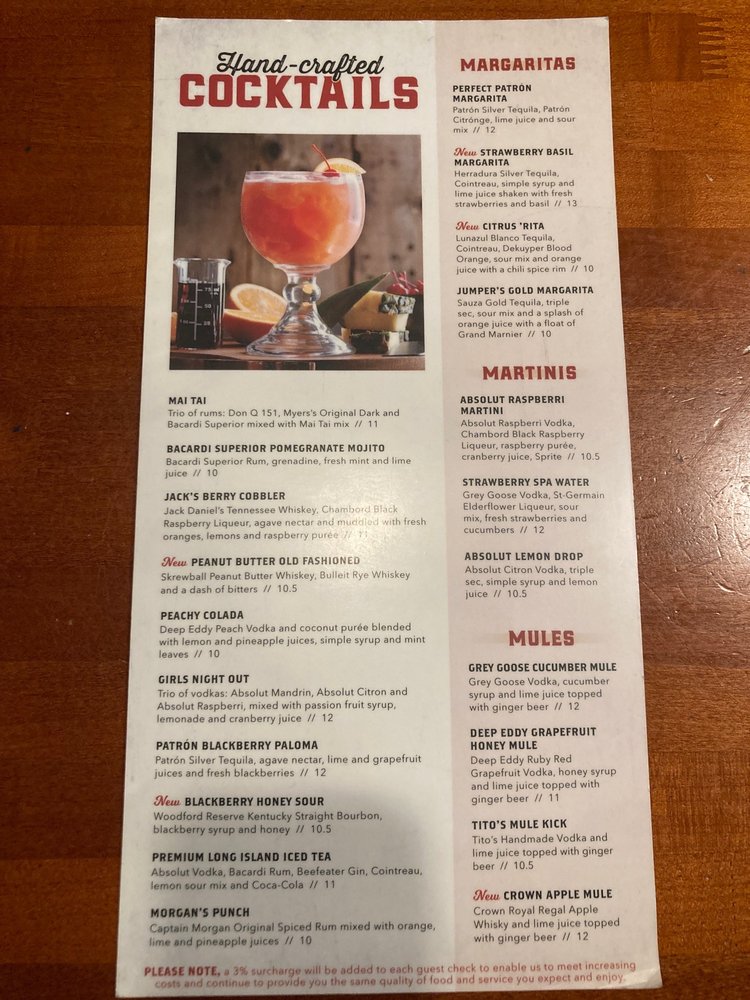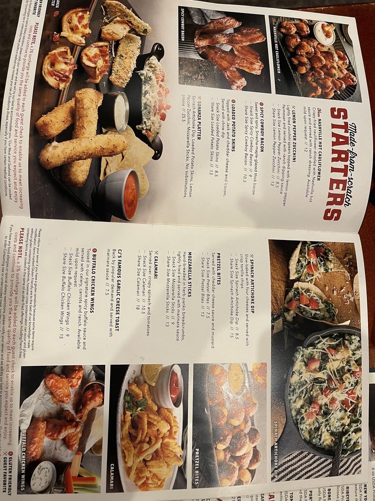 Spinach Artichoke Dip, Loaded Potato Skins, Lemon Pepper Zucchini, Mozzarella Sticks. No substitutions, please!